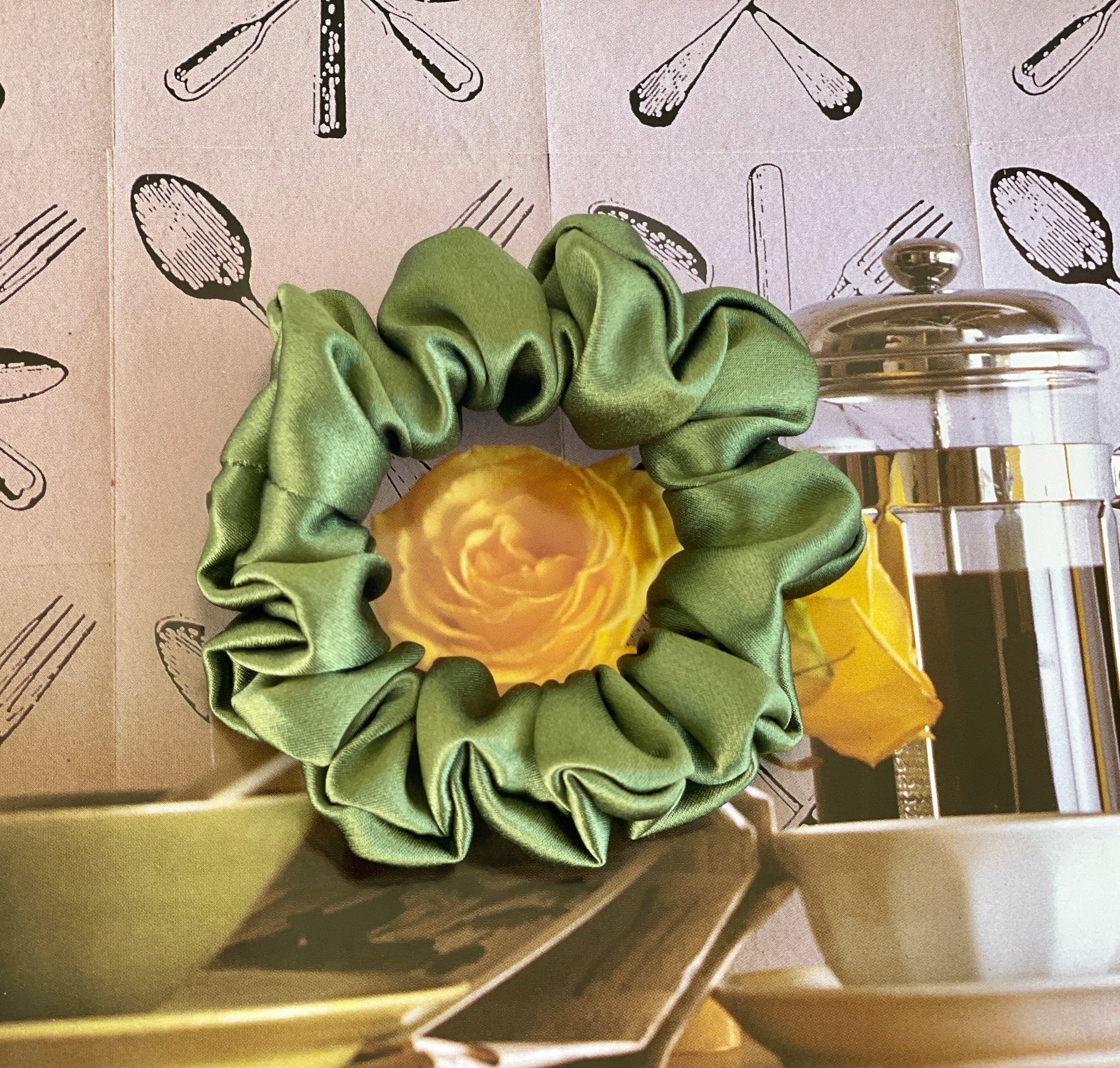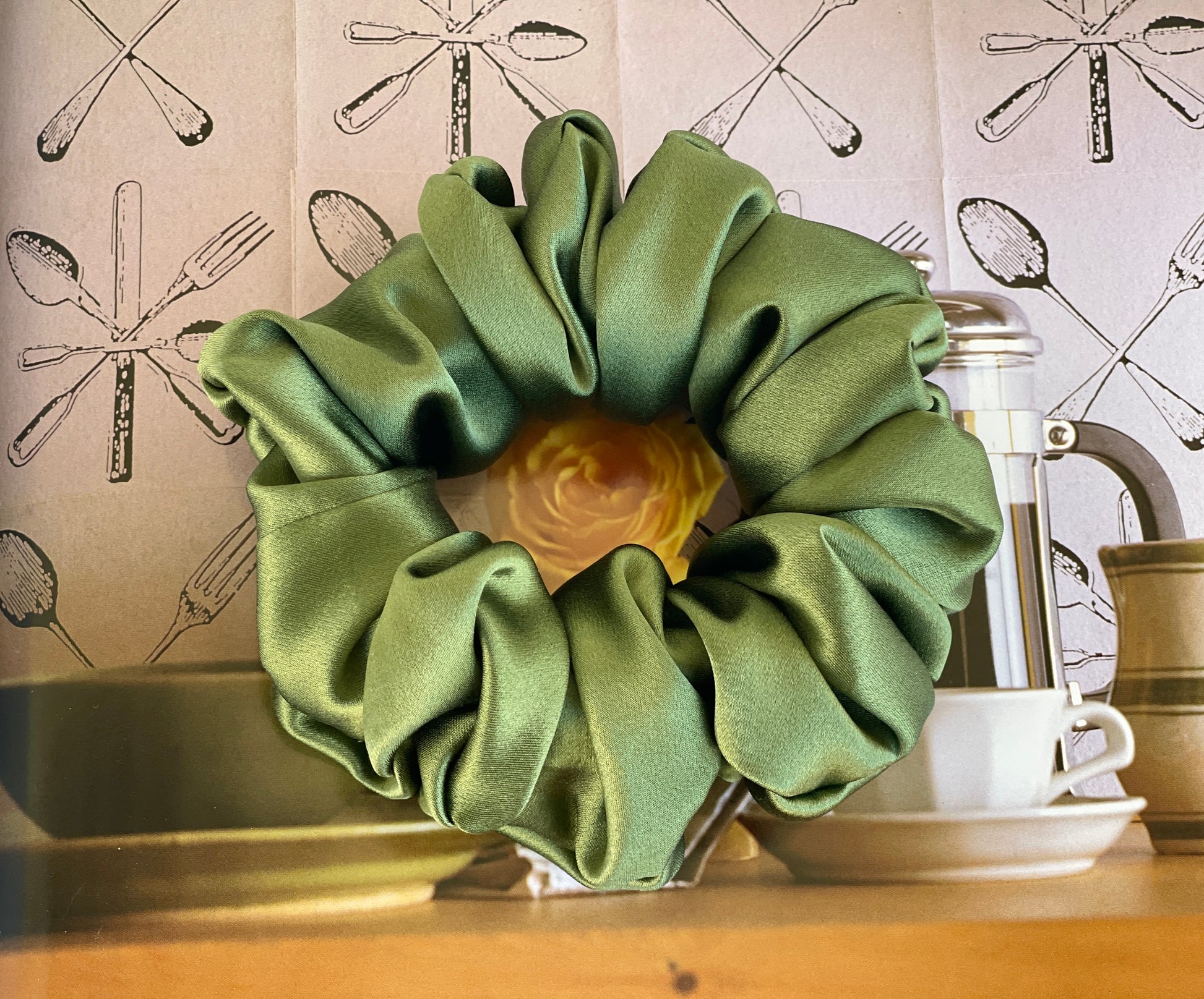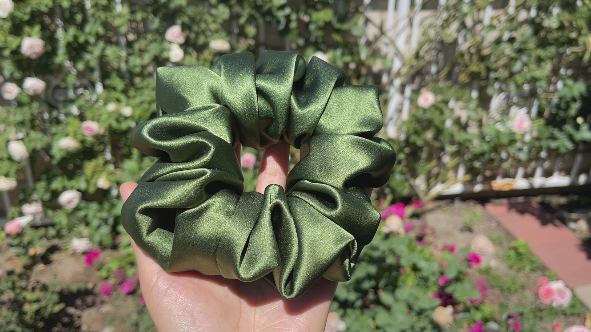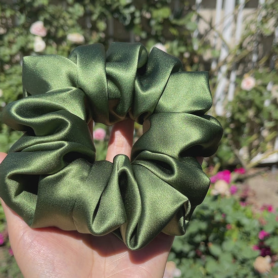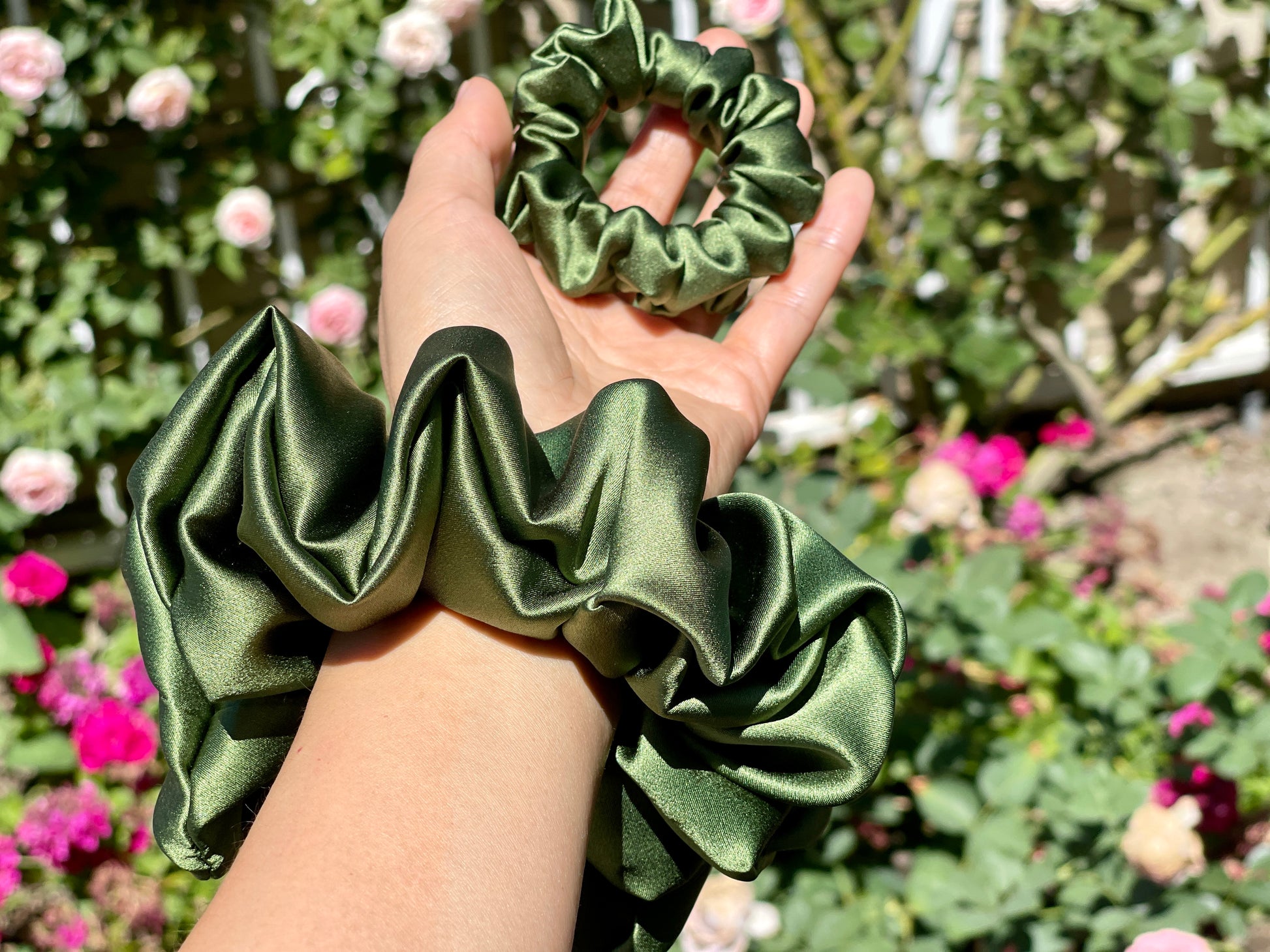 Dark Olive Green 30 Momme 100% Pure Mulberry Silk Satin Scrunchies XL Giant Jumbo Regular Skinny Ultra Thin Mini Hair Tie Gift For Wedding