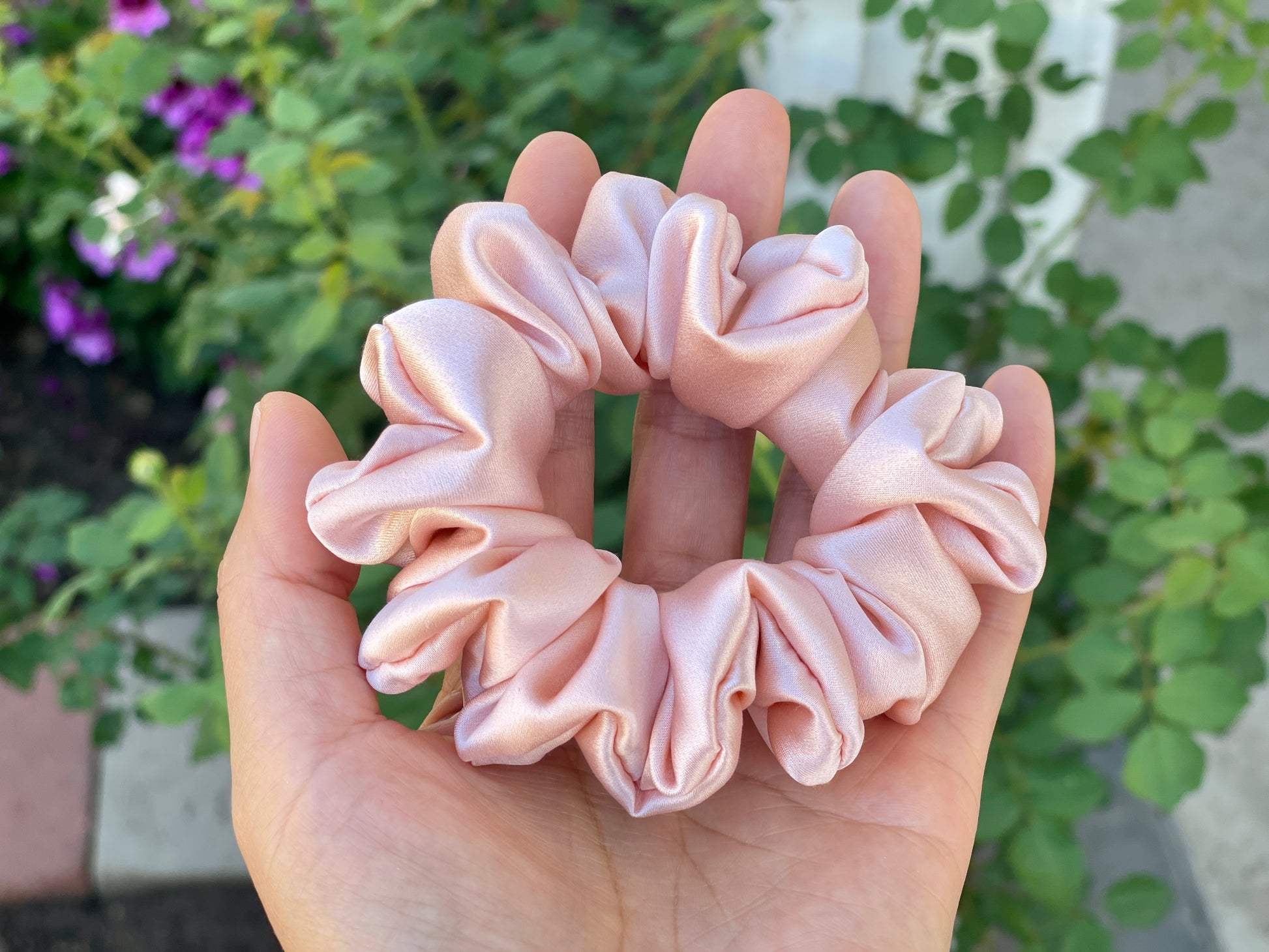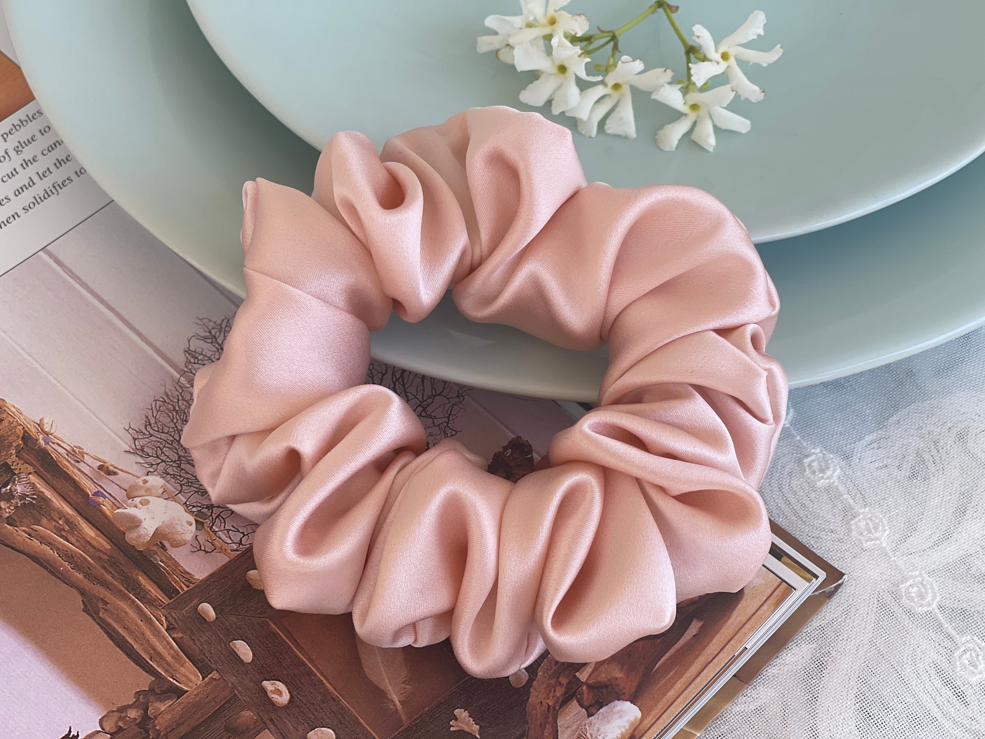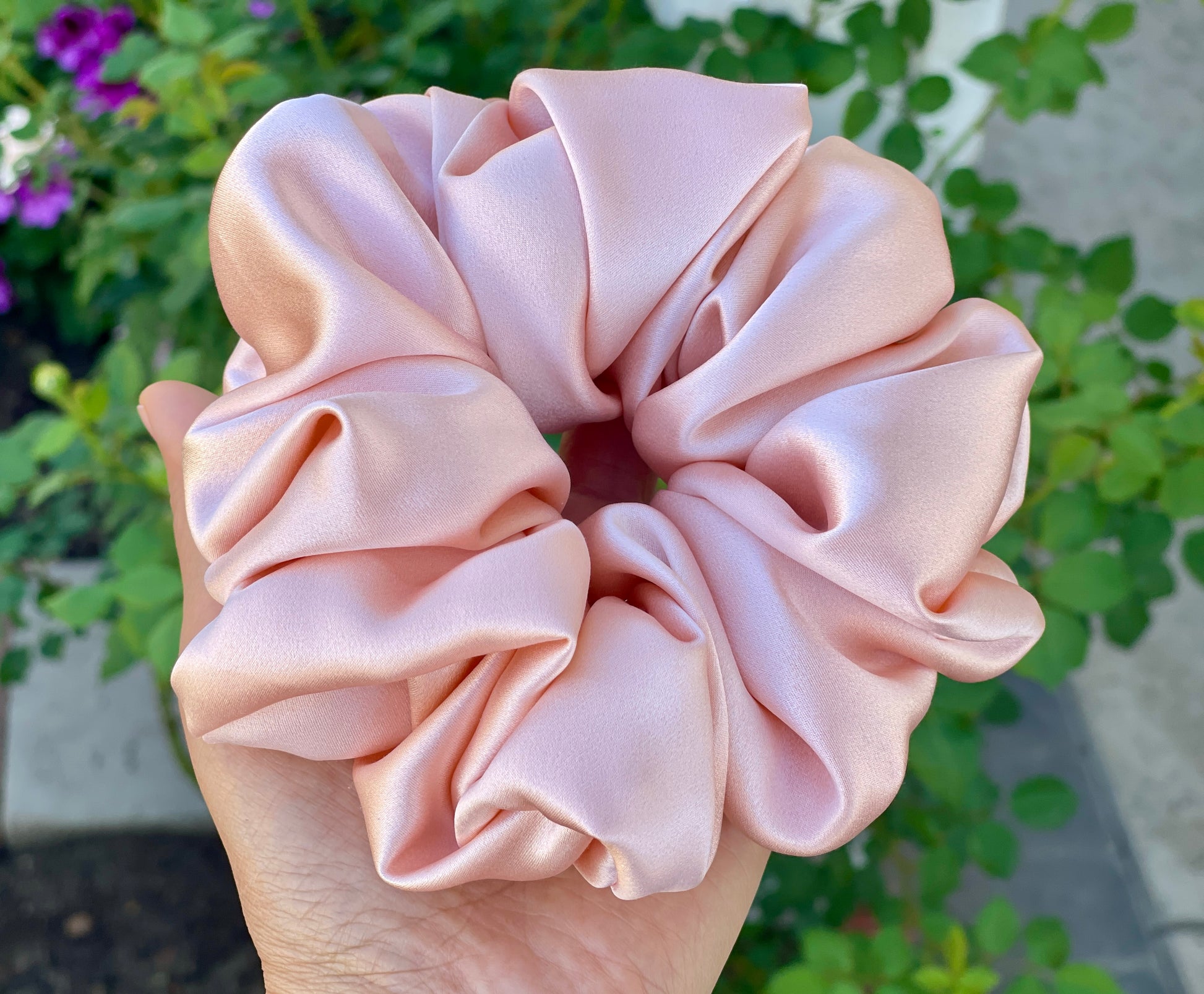 Pink Blush 30 Momme 6A Grade Pure Mulberry Silk Satin Scrunchies XL Oversized Jumbo Regular Skinny Thick Thin Mini Chic Hair Tie Romantic